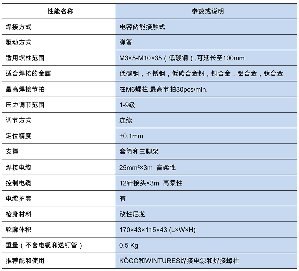 本款焊槍適配全系列KOCO和WINTURES焊接電源。推薦使用永創(chuàng)牌焊接螺柱。焊接的螺柱符合ISO13918的規(guī)定。焊接強度和質(zhì)量標準符合ISO14555的規(guī)定。